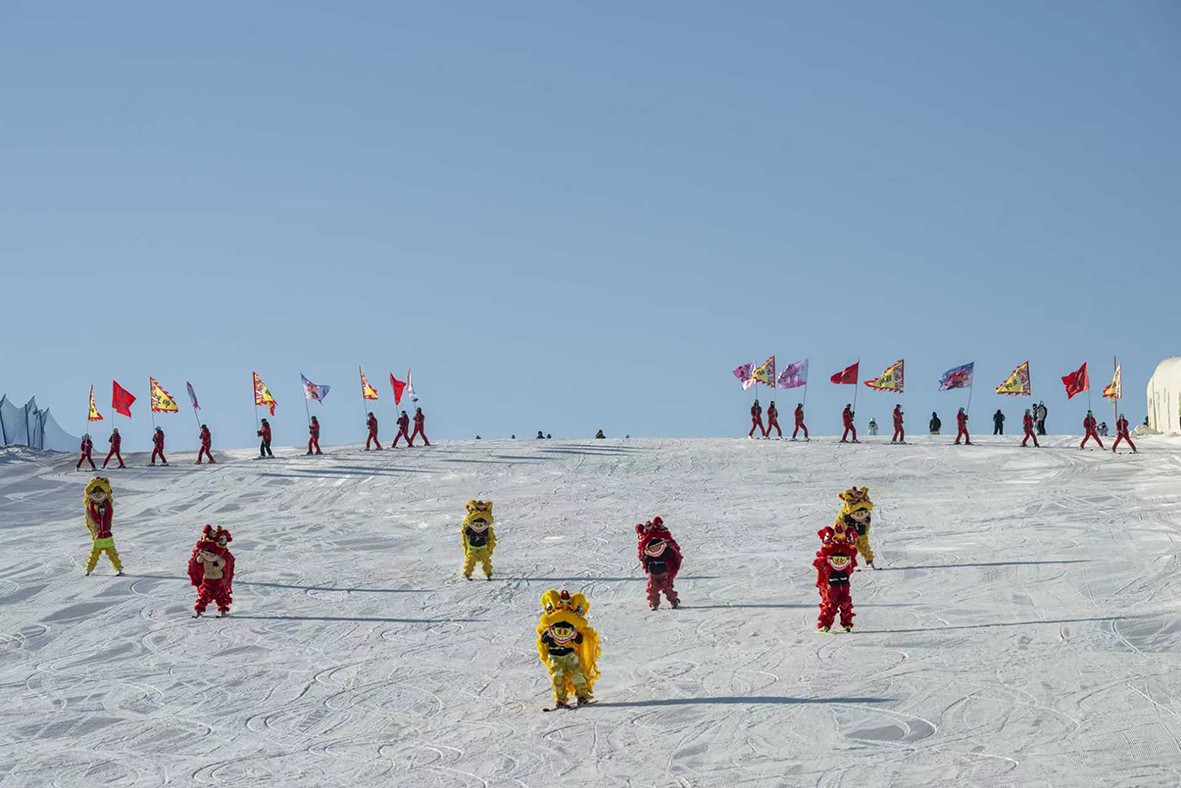 开板仪式上,欢快的歌舞表演瞬间点燃了游客的热情,动感的旋律与游客的欢呼声交织在一起,驱散了冬日的寒意。最引人瞩目的当属雪上舞狮表演,专业团队踩着雪板驰骋雪场,将传统舞狮与高难度双板技巧完美融合,尽显速度与力量,红黄相间的狮身在白雪映衬下格外耀眼,为现场观众送上了一场别开生面的视觉盛宴。